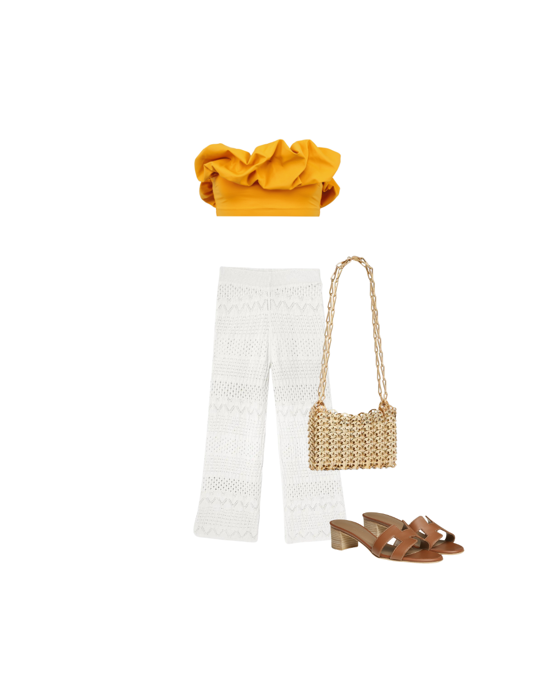 Pour un effet waouh au coucher de soleil, finalisez votre tenue avec notre haut de maillot Aurora en jaune safran : un bandeau avec des froufrous, ses détails travaillés et sa couleur audacieuse feront de lui la pièce maîtresse de votre look. Une envie de danser jusqu’au bout de la nuit tout en restant élégante et sophistiquée ? Notre iconic Montaigne se démarque grâce à ses volants travaillés, à porter avec un pantalon de tailleur noir et de beaux bijoux dorés, qui flaterons votre bronzage.