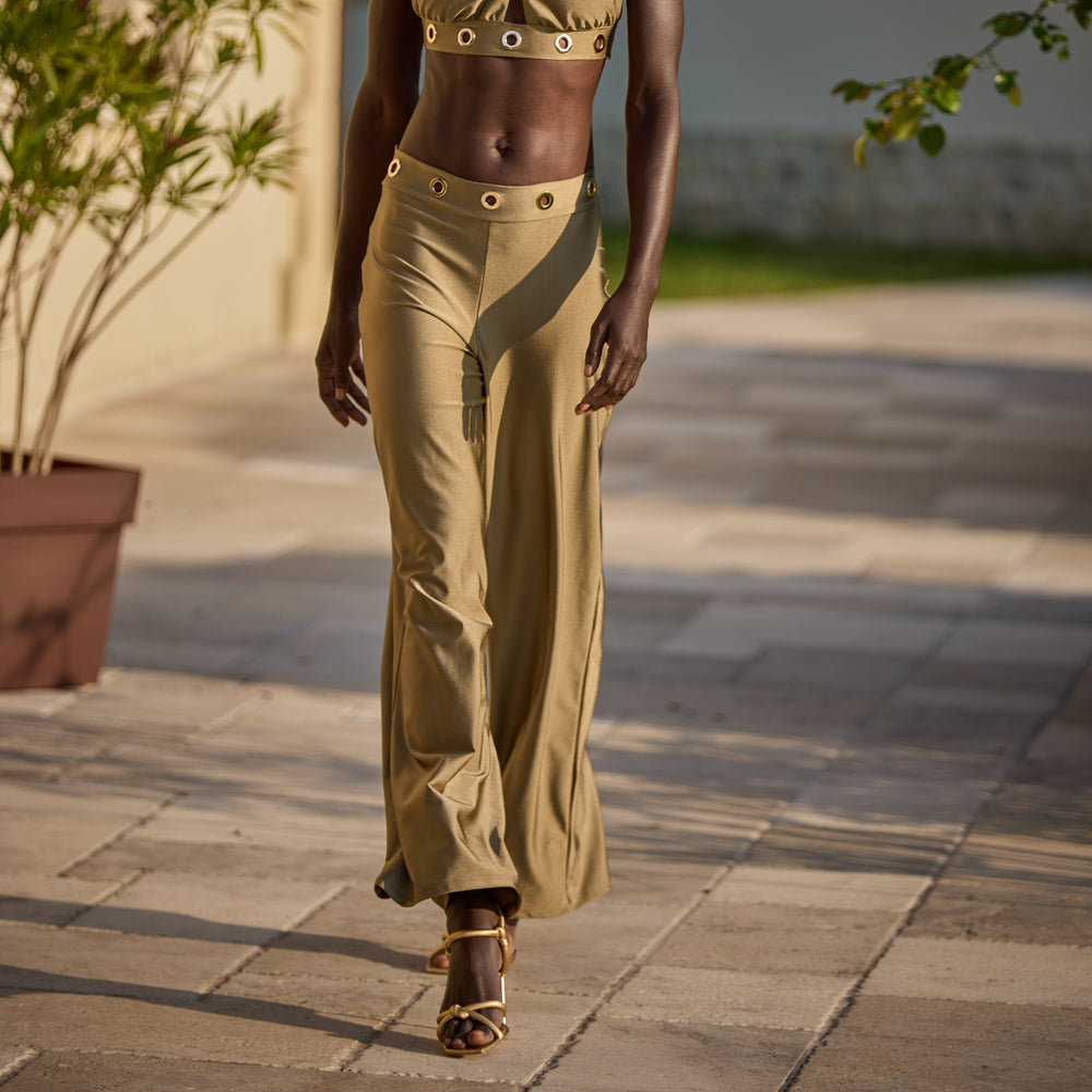 - Pantalon Déesse : Confectionné dans une teinte taupe pailleté irrésistible, ce pantalon chic avec ses détails dorés devient une pièce incontournable pour des tenues estivales élégantes.