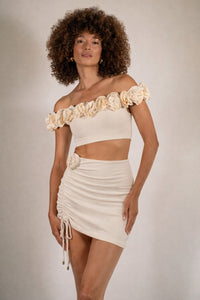 Sa coupe courte et asymétrique révèle subtilement la jambe, tandis que la fleur couture placée sur le côté apporte une touche sculpturale signature. Polyvalente et résolument chic, la jupe courte Flora blanc crème se prête parfaitement à vos événements festifs, mariages au bord de la piscine ou d’une plage, où son élégance naturelle sublime instantanément votre allure. Elle s’associe harmonieusement avec une large sélection de maillots de bain MAIÔ Paris pour créer des ensembles lumineux et raffinés.
