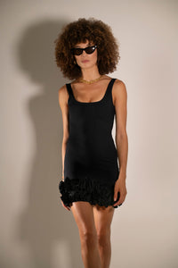 La robe courte noire Bégonia de MAIÔ Paris est l’incarnation d’une élégance moderne et minimaliste sublimée par une touche couture. Son design épuré met en valeur la silhouette, tandis que l’ourlet orné de fleurs délicatement façonnées apporte une signature féminine et raffinée, typique de l’univers Bégonia.