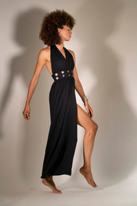 La robe noire Déesse de MAIÔ Paris incarne une élégance audacieuse grâce à son décolleté délicatement travaillé et sa coupe fluide. Ce modèle se distingue par une fente subtile le long de la jambe, apportant une touche de sensualité maîtrisée, tandis que les œillets gun metal à la taille ajoutent une note moderne et raffinée.