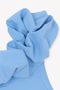 - Bleu tendre avec col volanté élégant.
