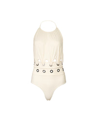 Audacieux et féminin, ce modèle iconique à œillets se distingue par ses découpes délicates et son travail de détails autour de la taille, créant une silhouette sculptée et raffinée. Le blanc crème illumine naturellement les courbes, offrant une allure à la fois intemporelle et sophistiquée.