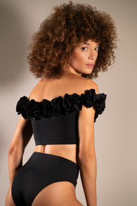 Le maillot de bain 2 pièces noir Bégonia de MAIÔ Paris se distingue par son élégance couture et ses fleurs délicatement façonnées, qui apportent une dimension sculpturale à ce maillot de bain à fleurs unique. Son haut orné de pétales noirs crée une silhouette féminine et affirmée, parfaite pour sublimer le buste avec sophistication.
