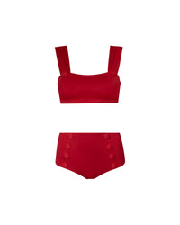 Le maillot de bain 2 pièces rouge Alma de MAIÔ Paris incarne une élégance graphique inspirée du chic parisien. Ce maillot de bain taille haute orné de boutons rétro évoque un charme vintage revisité.