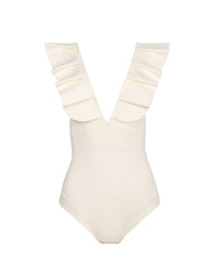 With its flattering V-neckline and subtly arranged ruffles, the Isabela model seduces with its sophisticated, feminine design. Its soft, luminous creamy-white hue evokes purity and timeless elegance, ideal for both seaside escapades and dressier moments by the water.